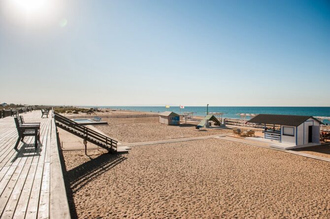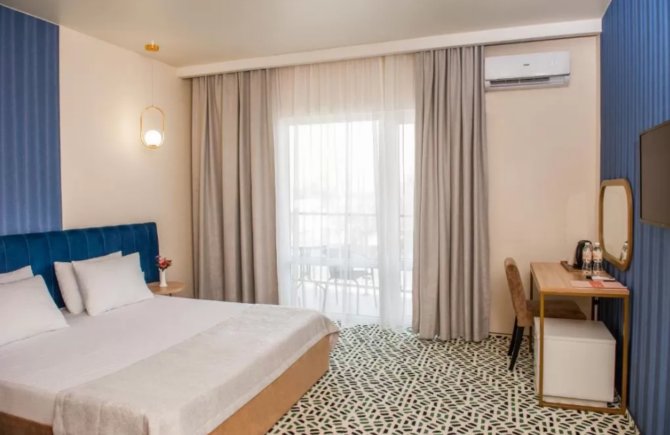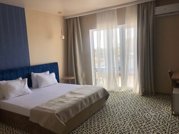 The hotel was built in 2019. Its location is ideal for families with children, as well as water sports – windsurfing and kiting. The coastal strip is quite wide, and the entrance to the sea is gentle and gradual. Sunbathing, swimming and riding on boards with the help of a sail or kite can not only be at sea. Blagoveshchenskaya is called the village of three reservoirs. It is located on the Taman Peninsula between the Vityazevsky and Kiziltash estuary, the third side is washed by the Black Sea.
