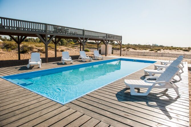 - Large heated swimming pool, size 30 m (length), 8 m (width), 1.5 m (depth). Around the sides there are sun loungers with umbrellas;