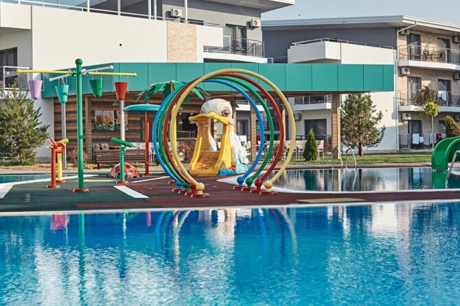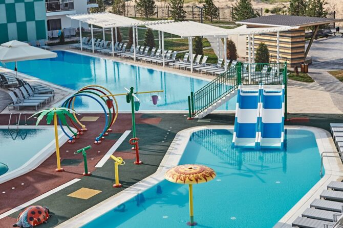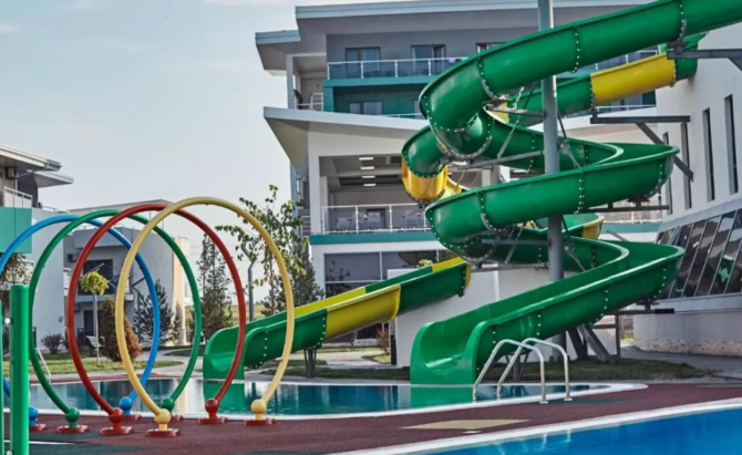- Small heated children’s pool, size 14 m (length), 6 m (width), 60 cm (depth). Along the perimeter of the bowl there are three water slides;