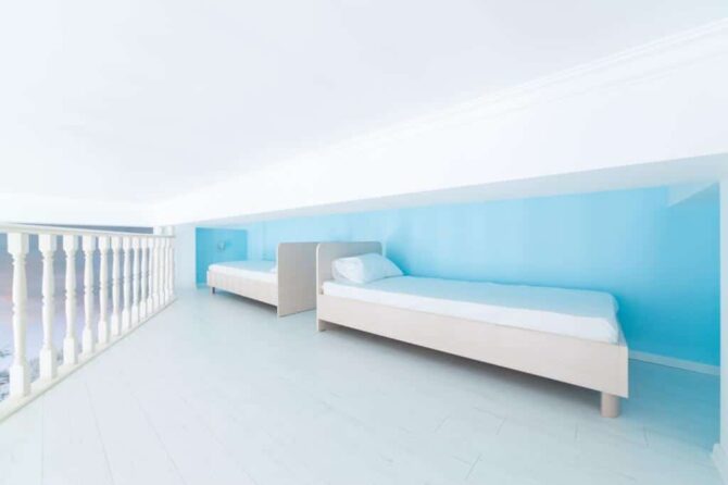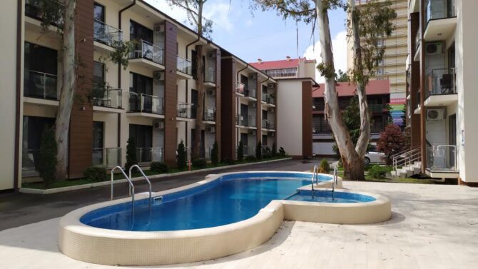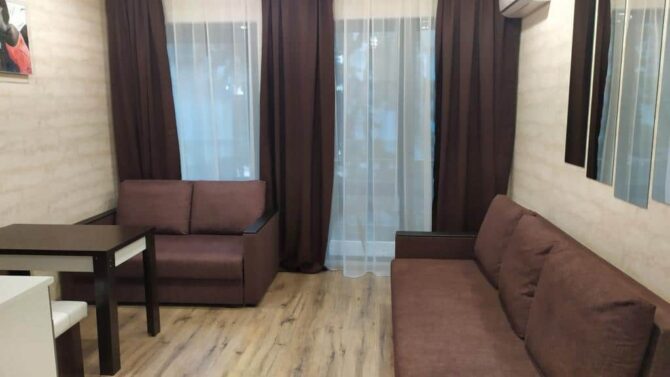 On the ground floor of the five-storey building there are modern “Duplex apartments with a view of the pool”. Their area is 40 square meters. The apartment is divided into several zones. On the second level there is a cozy bedroom with a large double bed. The first level is a comfortable living room with a soft sofa and TV. Thanks to the sofa bed, the apartment can accommodate up to 4 people at a time. In the yard there is a swimming pool, a great opportunity to refresh on a hot day. The road to the sea takes no more than 10 minutes.