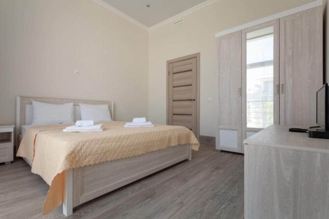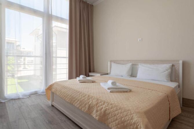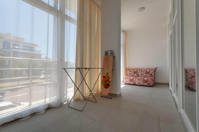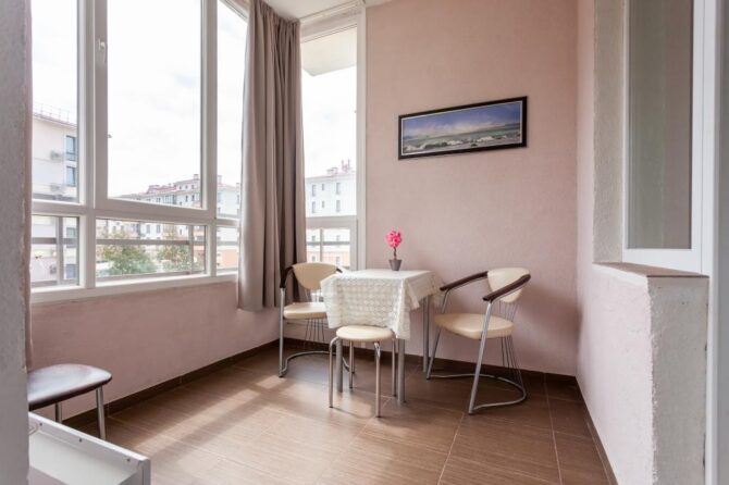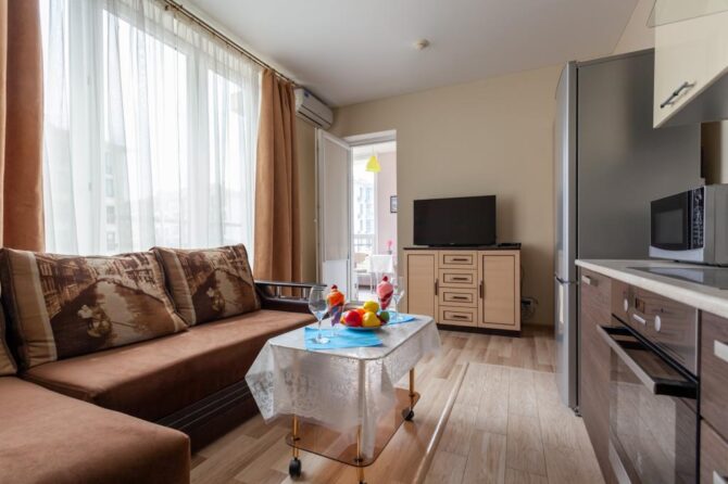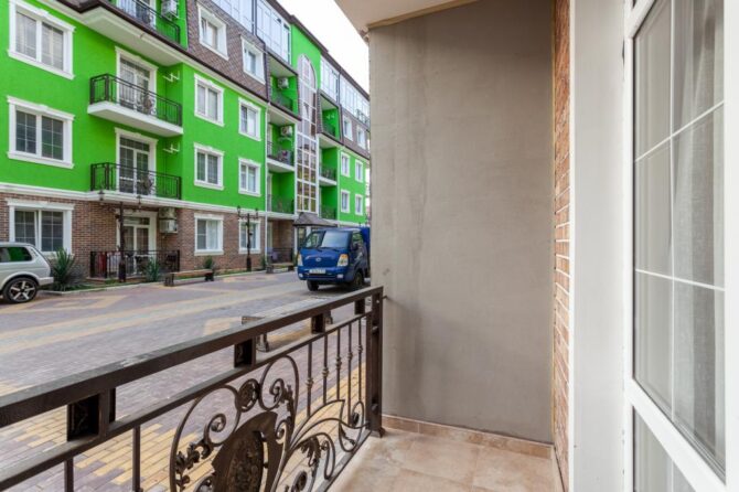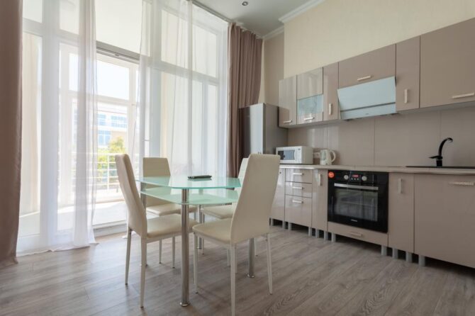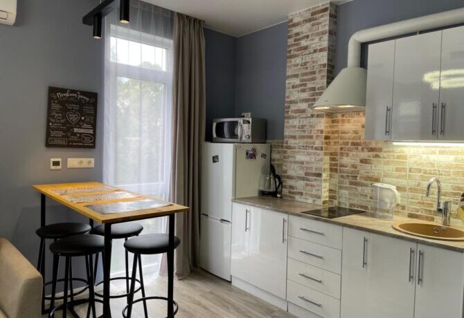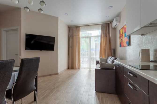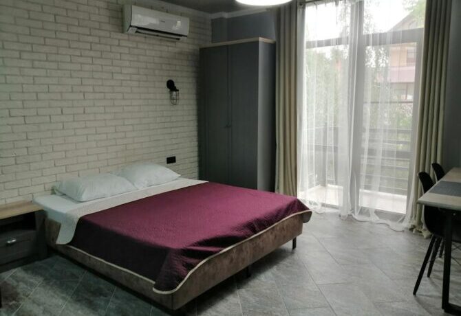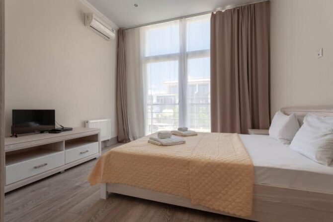 Spacious apartments with a French balcony are a cozy apartment located on the 5th floor of a ten-storey building of the elite residential complex “Sorento Park”. Here, even the most demanding guests will feel a high level of comfort and warmth of home coyness. Literally in 5-7 minutes walk through the park area is the Black Sea coast, which makes this accommodation option just ideal for families with children.