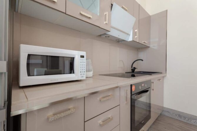 Extras include a fully equipped kitchen. Stove, full set of dishes, microwave, electric kettle make it possible to prepare a full breakfast, lunch or dinner.