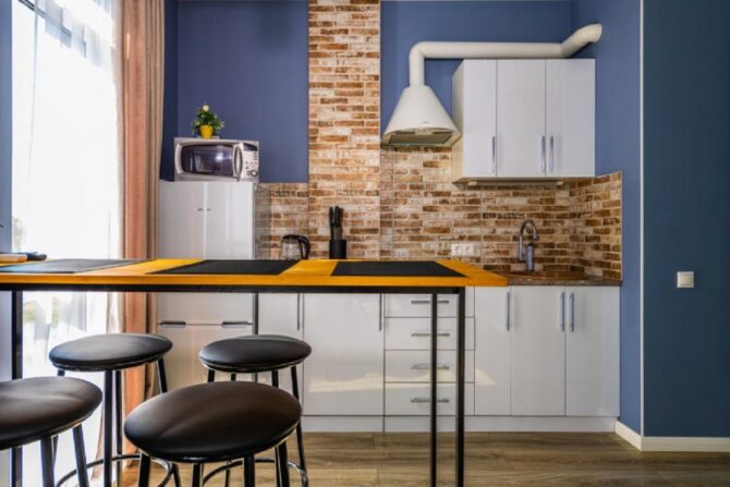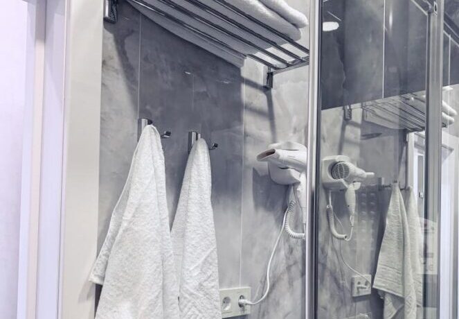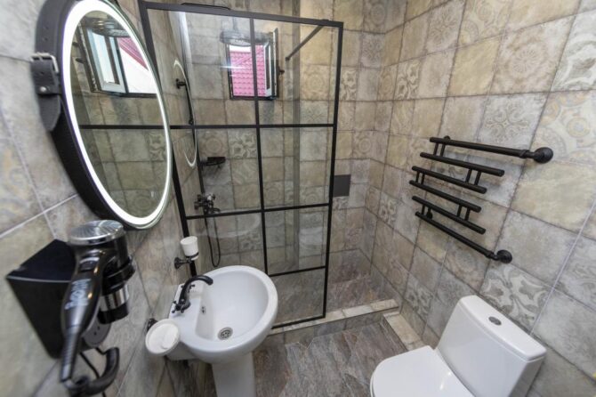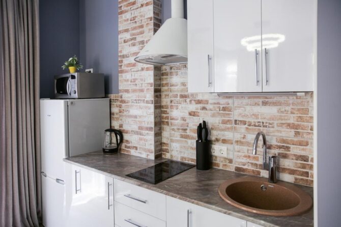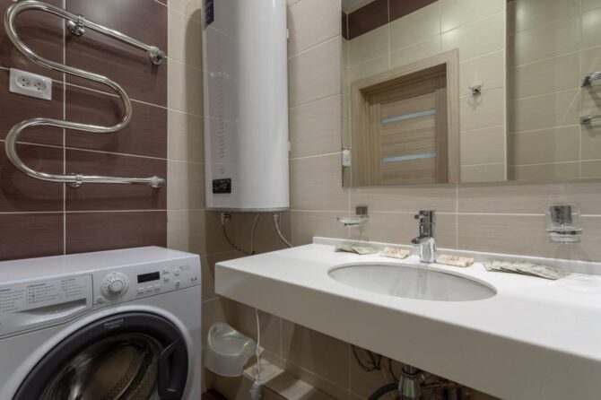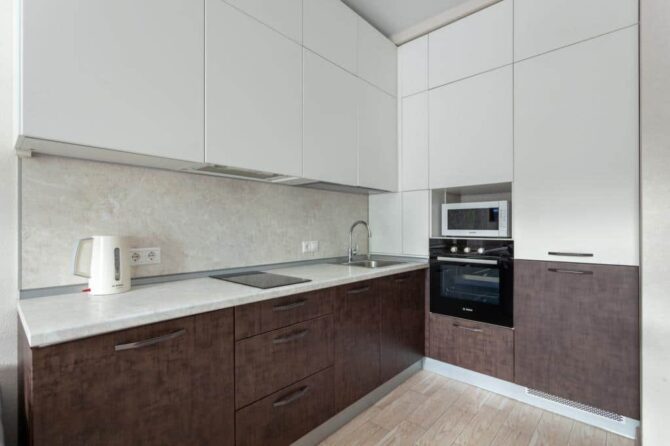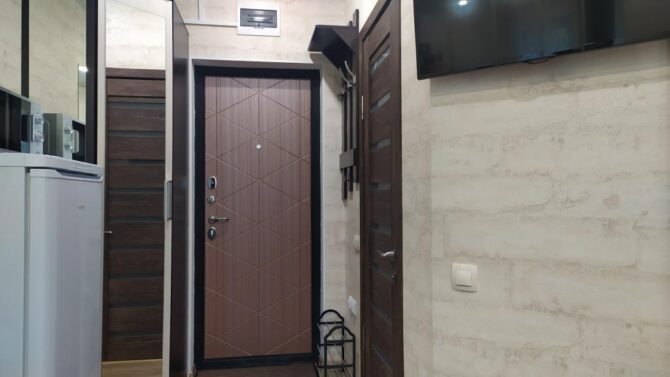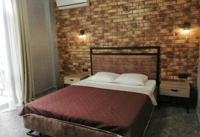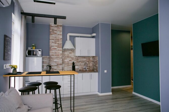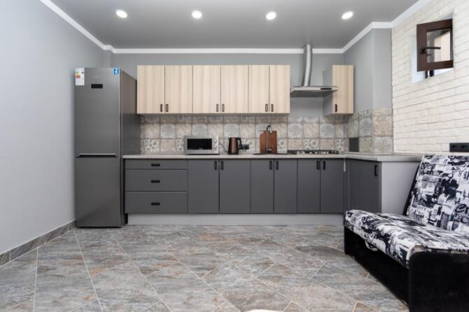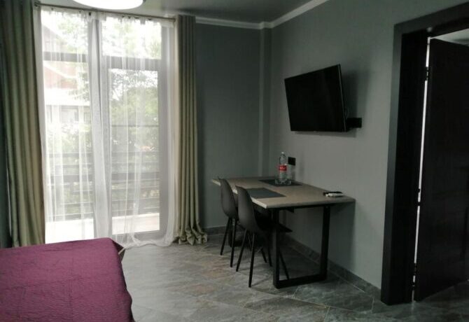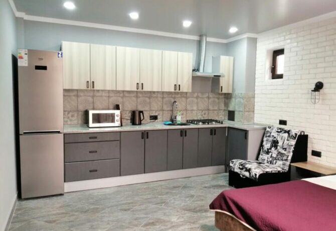 For guests traveling by private transport, there is a paid parking. It is located just 30 meters from the hotel. “Coffee style room” is a one-room studio apartment. The cozy space is decorated in a coffee style. It is located on the second floor of a three-story building. The apartment is perfect for any category of vacationers. Here, both newlyweds and couples with children will feel comfortable. The apartment for a comfortable stay has absolutely everything. Thanks to the well-equipped kitchen, guests can prepare their favorite, homemade, delicious food at any time.