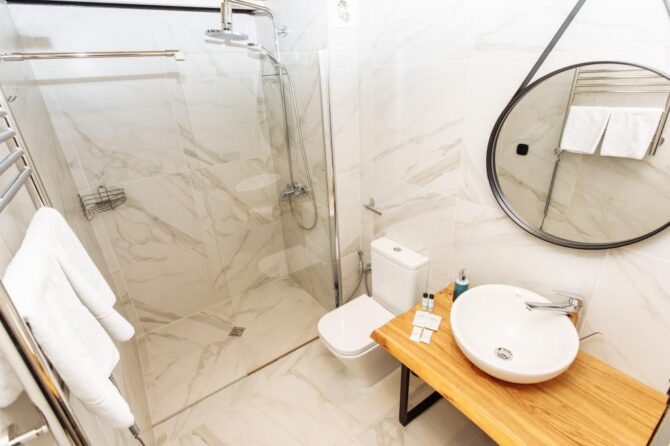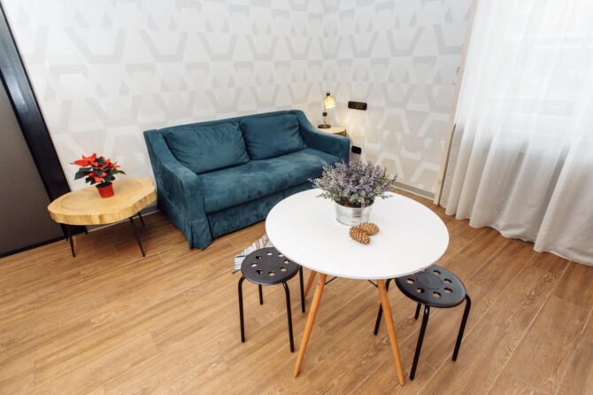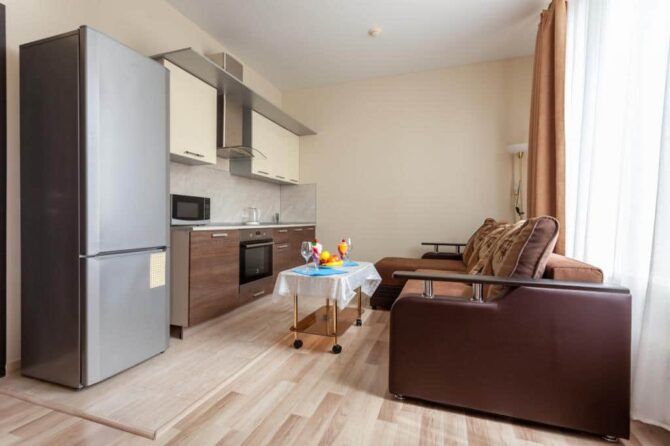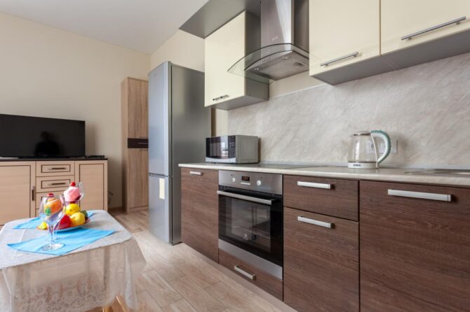 The spacious living room has a seating area and a TV. Here you can gather a friendly company and have fun with a cup of fragrant tea or a glass of your favorite drink. For self-catering, the apartments are equipped with a kitchen. Guests can always prepare a familiar homemade dish or organize a light snack.