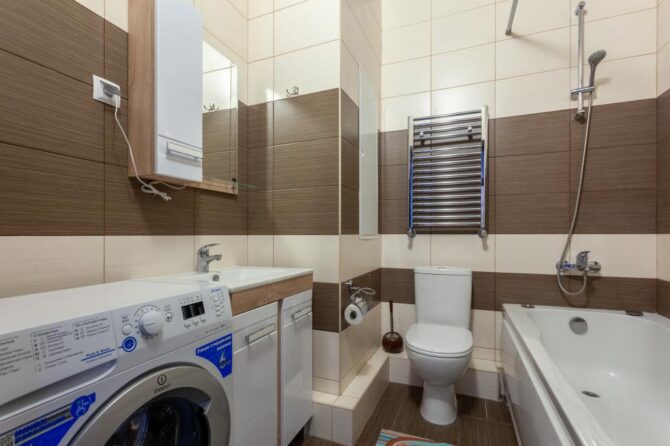 The apartment has a fully equipped kitchen with microwave, refrigerator, stove, electric kettle and a full set of dishes. This solution allows you not to give up the usual homemade food, even being in another city. The seating area has a seating area with a TV. The fold-out sofa can be used as an extra bed.