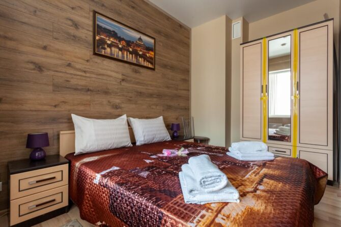 One-bedroom apartment,with a total area of 43 square meters, is located in the residential complex “Korona”. This is a modern apartment consisting of 2 bedrooms. Here, 4 guests will feel comfortable at the same time. The apartment is suitable for couples with children and for those who travel alone, but are not used to staying in noisy hotels.