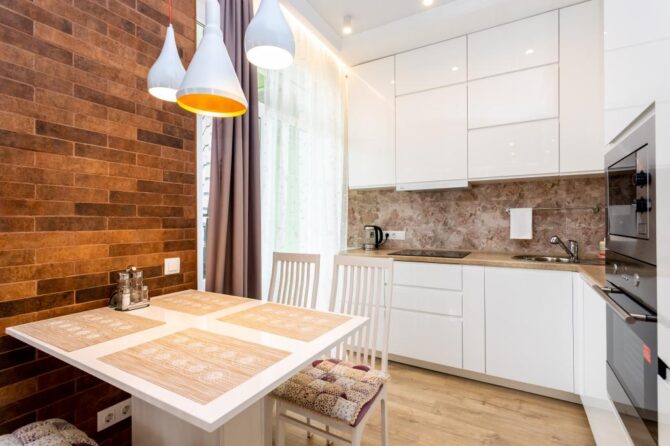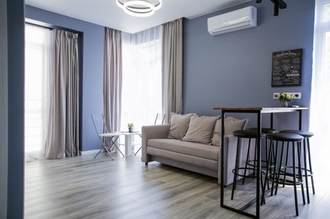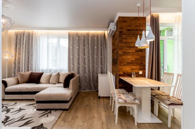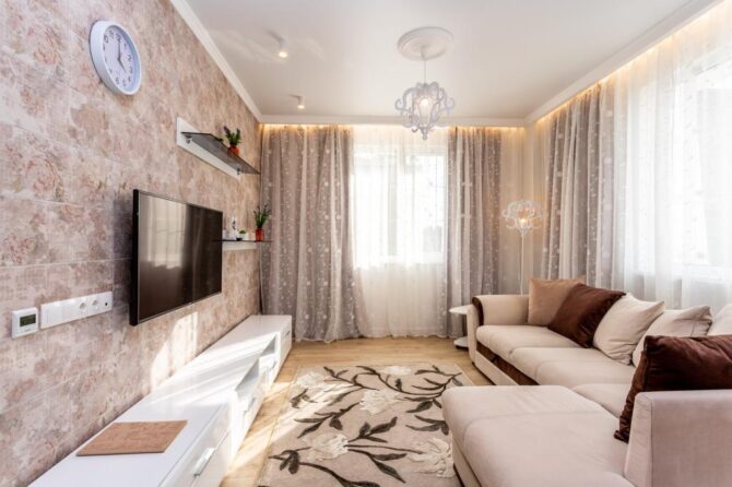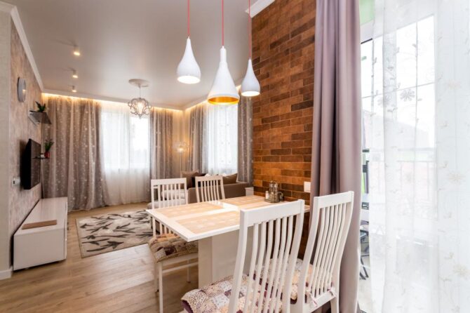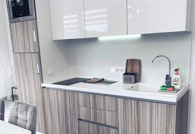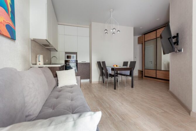 The apartments are decorated in light shades, which are perfectly combined with classic furniture. Thanks to the large window inside is always bright and cozy. The apartment is divided into several zones. The separate bedroom has a large double bed. Comfortable mattress with quality bed linen guarantees a good night’s sleep at home.