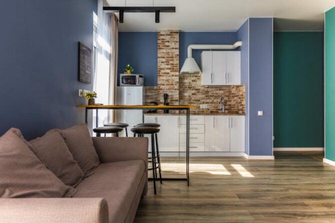 The apartments have a well-thought-out layout. A separate bedroom with a large bed allows you to relax in peace and tranquility. The living room is equipped with a soft sofa, which can be used as an extra bed.