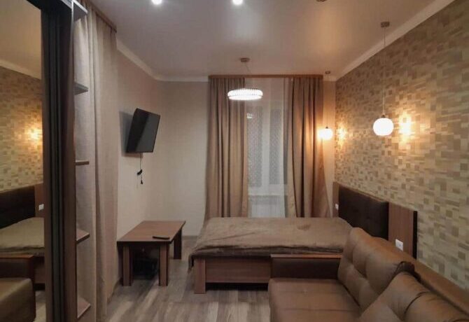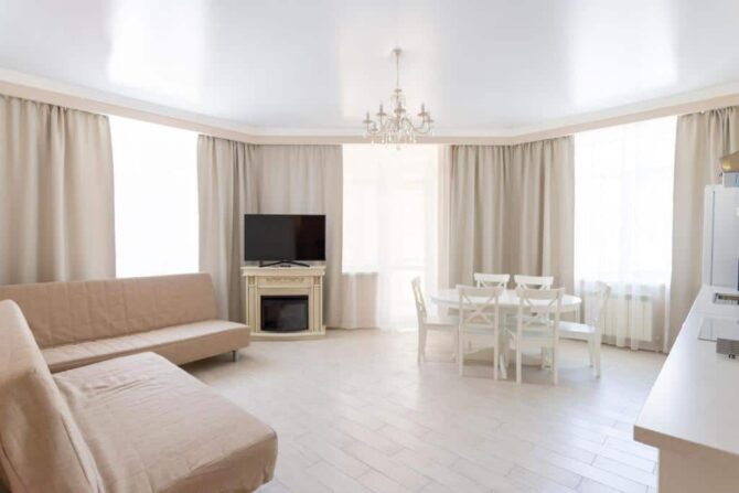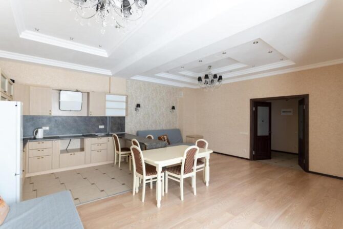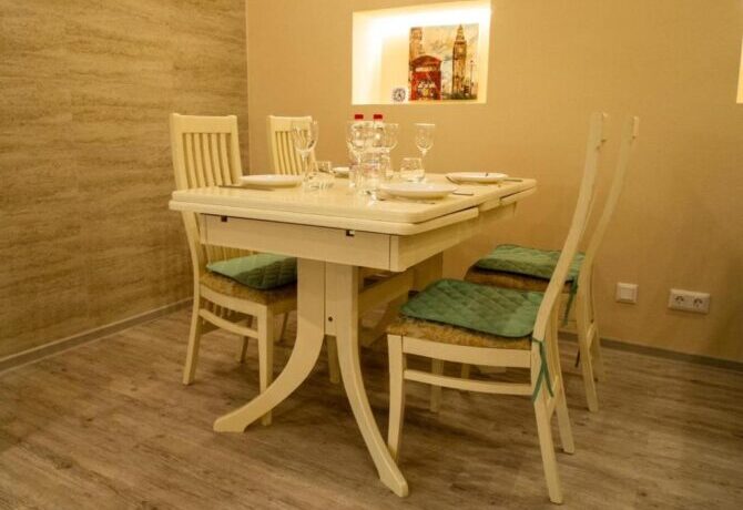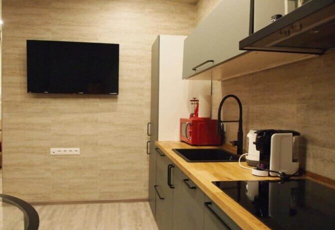 The apartment is beautiful, comfortable and not philistine, the kitchen is equipped at a minimum, but enough – a microwave-kettle-refrigerator, in the living room there is a modern TV. According to reviews, there is not enough washing machine.