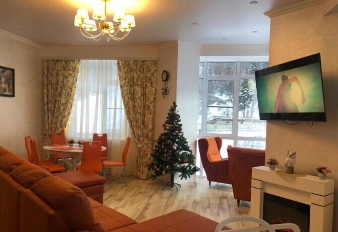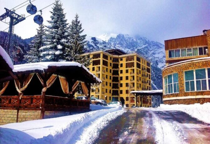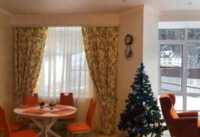 Not far from the center of the village, surrounded by pine trees and with a stunning view of the mountain slope, there is the Sputnik residential complex – a new apartment building built according to the project familiar to all citizens. Almost all the apartmentsthat it has, private owners rent to tourists.