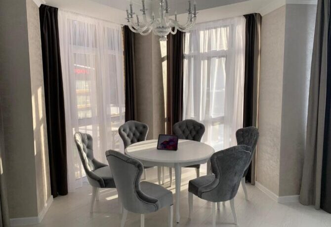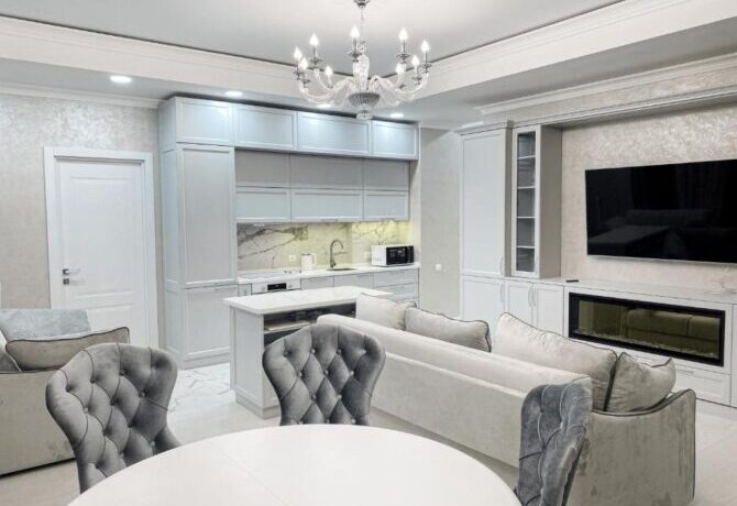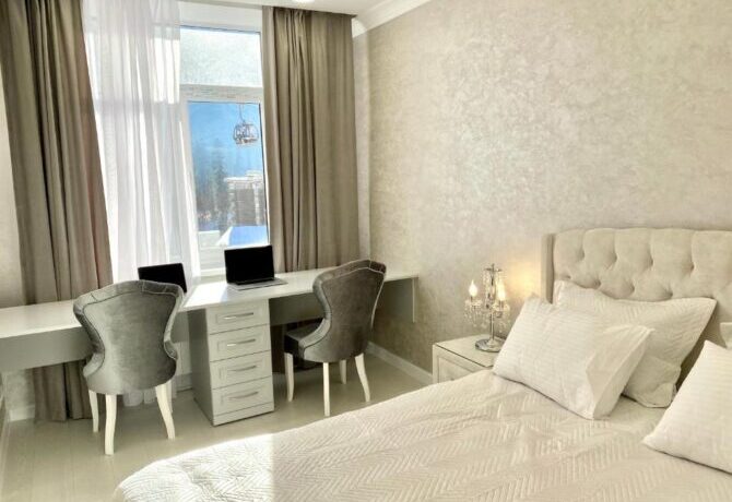 In the residential complex “Vershina” there are many excellent offers for tourists, and the 3-room apartment “Mountain Paradise” with two bedrooms on the sixth floor will definitely appeal to most. According to reviews, it is obvious that the owner did not spare money: everything that is in the apartment is not from the economy segment. The apartments are decorated like an expensive hotel room – in one tone (silver-gray with elements of marble), but they are distinguished from ordinary hotels by thoughtfulness and attention to the comfort of guests.