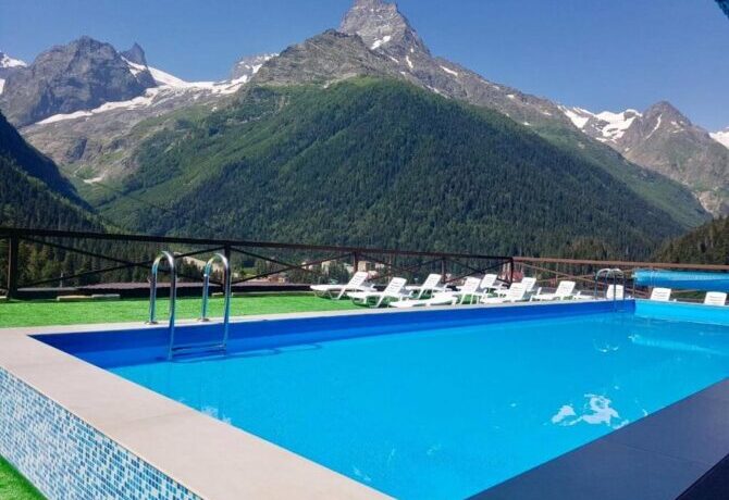 The 13-storey apart-hotel “Vershina” is located a little away from the center of Dombai, but close to the main cable cars of the resort. The hotel was built not so long ago, has not yet had time to dilapidate and against the background of snow-capped mountains it looks spectacular, but without unnecessary pathos. Apartment “Peaks” are popular with tourists: in the season, the room must be booked in advance.