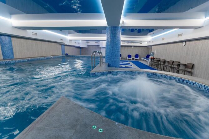 This is a large hotel complex, more like a residential apartment building: on the first two floors there is a sports and bath complex, billiards. Above are the rooms (on the last floors – the most prestigious, best and expensive). Heating is centralized, but hot water is autonomous. There is a heated pool on the roof, but it is often closed for repairs, so you should not count on it especially.