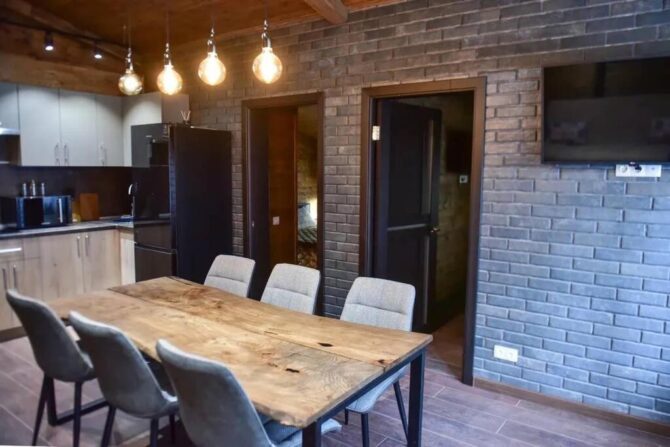 New, furniture, the smell of pine trees, air conditioning and heater, a good bed – it will be pleasant to relax after trekking. In the apartment (which is rare for Dombai), there are disposable slippers, cosmetic and bath accessories, and the kitchen complete set exceeds all expectations.