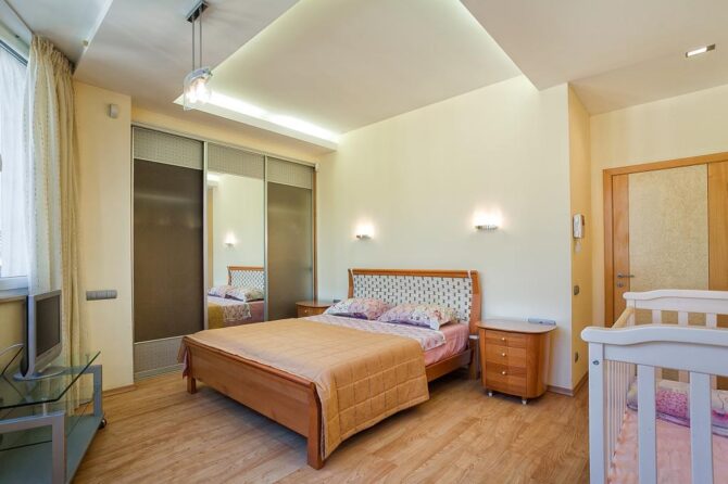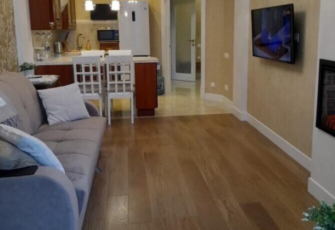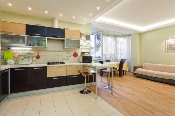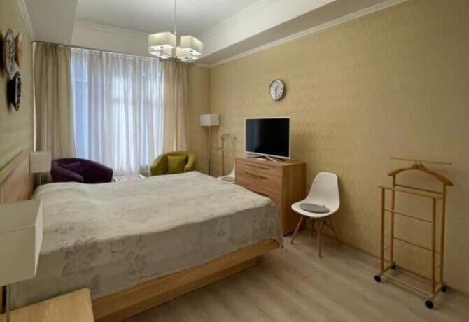 Spacious and bright, the apartments can accommodate up to 5 people. The house is 11-storey, the apartment is on the 7th floor. The kitchen is equipped with a gas stove, refrigerator, microwave. It is combined with a living room, where there is a double bed and a sofa. There is a separate bedroom. The owner requires payment of a security deposit upon check-in, which is refundable upon departure. It provides all reporting documents. Families with young children like to stay here. They are provided with a pot and a baby cot. Near the house there is a real zoo. The infrastructure located nearby also includes a cinema, a theater, a nightclub, a spa center with a sauna, a bicycle and roller skate rental, a yacht club. Such sports activities as horse riding, water sports (on-site), fishing, hunting, golf course on-site.