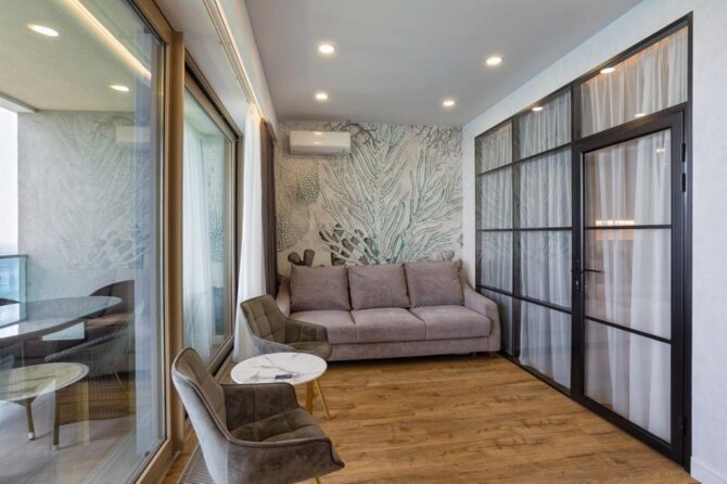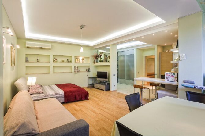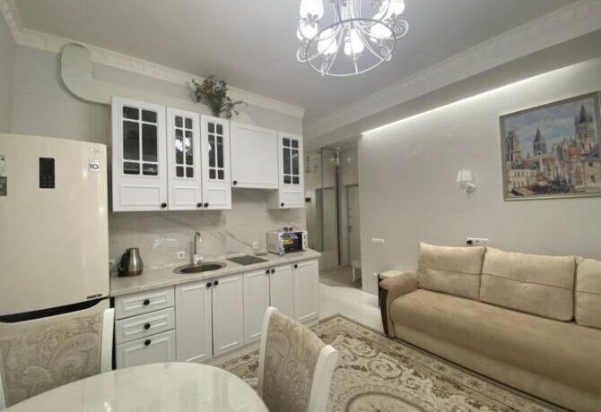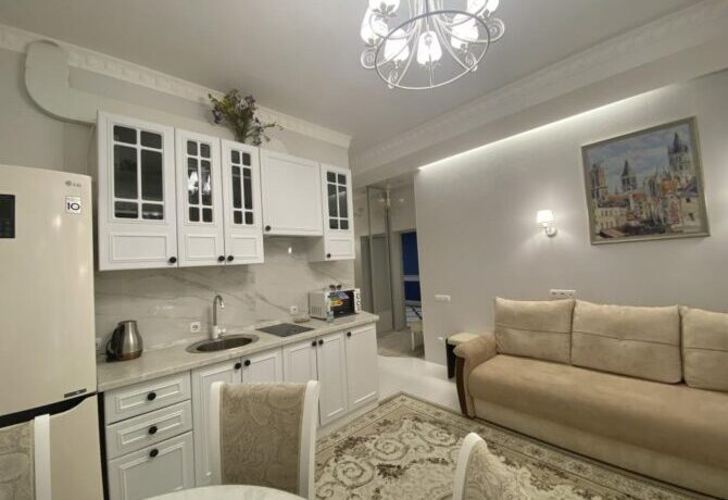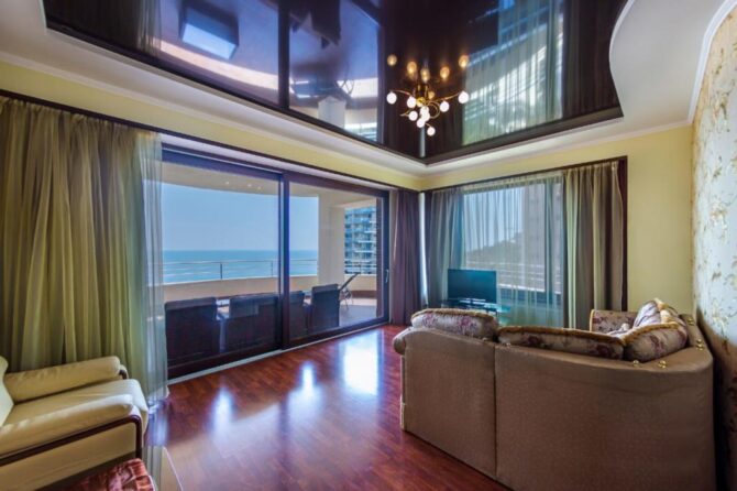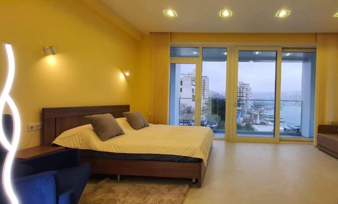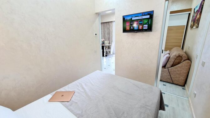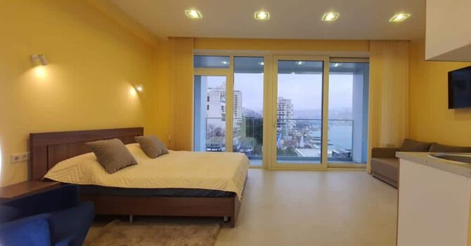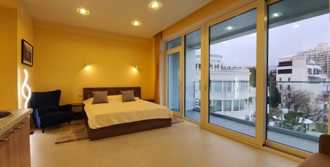 There is no division into rooms in this apartment. By zoning the room, 2 plots are defined – a bedroom with a king size bed and a living room with a sliding large sofa. Apartments with panoramic windows occupy the 9th floor of a 10-storey building. RC “Leto” is a new residential complex, which is considered the most convenient and elite for vacationers. It was built on the seashore 50 meters from the beach. From the courtyard you can immediately go to the Yalta Embankment. Near the house there are several cafes, a restaurant, a SPA center. In addition to security, which monitors the order, a concierge works in the building. Upon arrival, you can see the list of its services. Until recently, only hotels offered such a service. The apartments are freshly renovated. Smoking is prohibited.