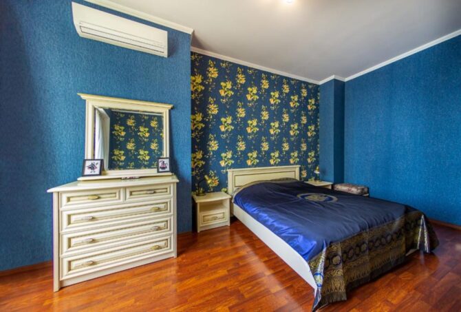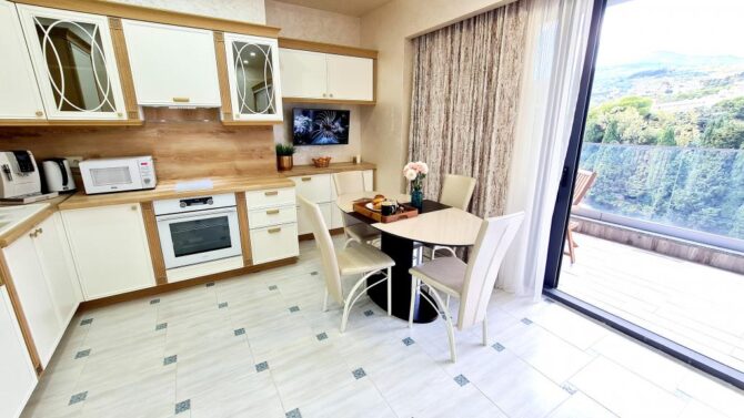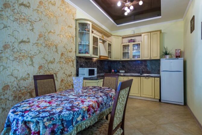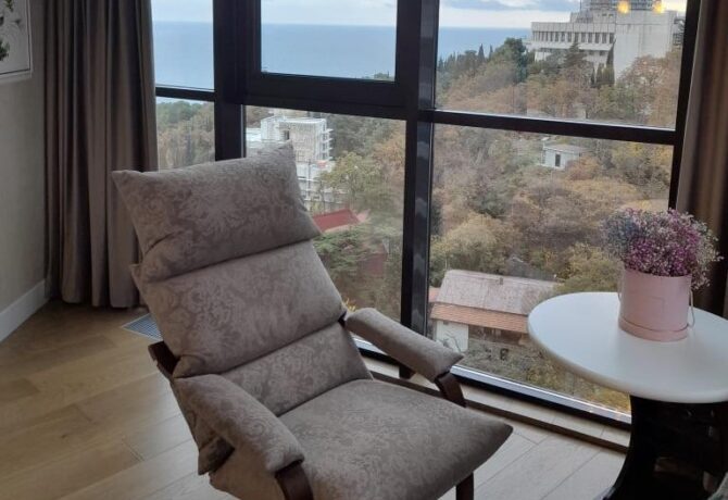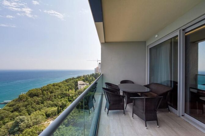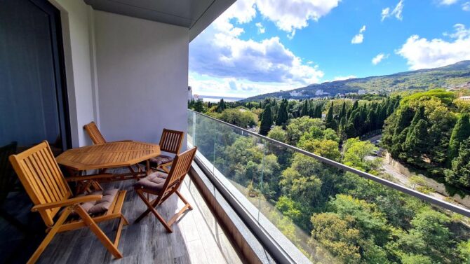 The apartments,decorated in a modern style, are located in the residential complex “Zazerkalye”. The house is located 150 meters from the sea, a walk to the equipped beach will pass through the alleys of the subtropical park. Such hotels are not uncommon in Yalta, but private apartments have never been so luxurious and convenient for living. The apartment is on the 15th floor. It offers sea views. On the balconies there is wicker furniture (armchairs, sofa, table). The kitchen is fully equipped with the necessary appliances for cooking. The bathroom has a washing machine. The complex provides guests with all the conditions for recreation. There is a sauna, children’s and sports grounds, an outdoor infinity pool, gazebos, a fountain and a pump room with mineral water. There is a restaurant in the building.