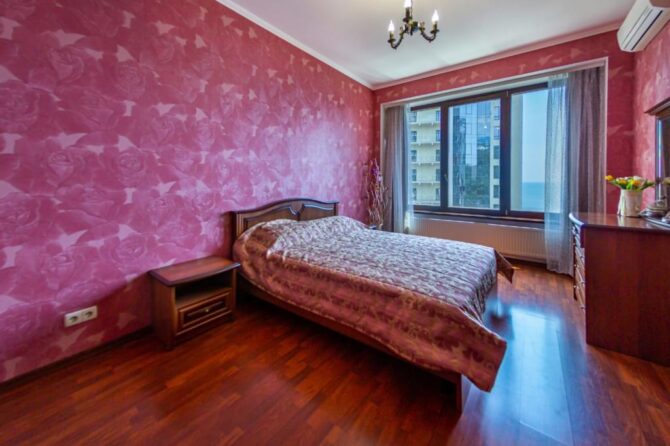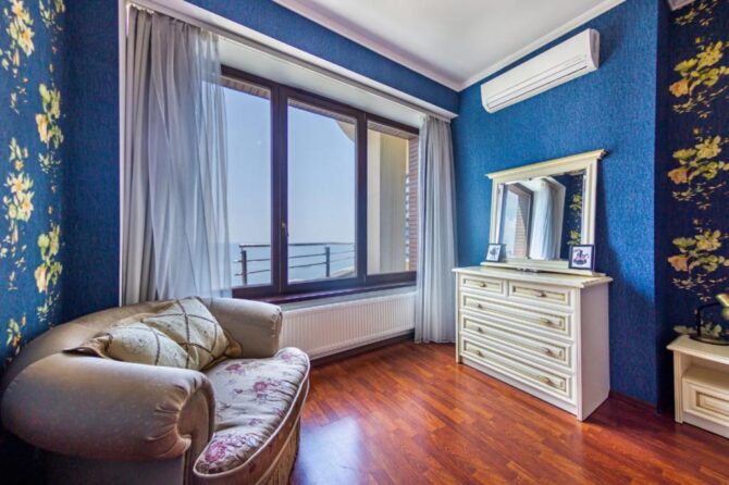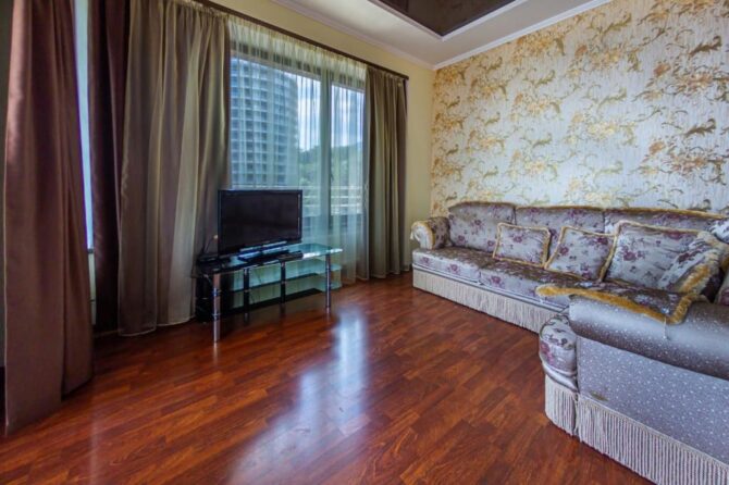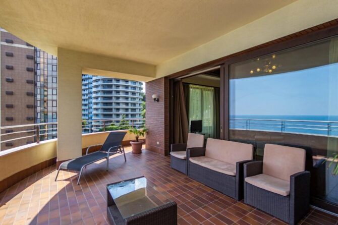 For a family with children or a group of 6 people, you can stay for a vacation in a spacious apartment with two separate bedrooms. The hosts provide two price tags – daily and monthly. The apartment is located on the 10th floor of a 20-storey building. Among all the options, it is distinguished by the presence of a panoramic terrace, on which upholstered furniture, a table and a chaise longue have already been installed. You can smoke. The panoramic view captures part of the city, the park and the sea. From household appliances there are air conditioners, washing machine, electric stove, microwave, full set of dishes, iron. The owners will help to organize a transfer of any comfort class. In the yard there is a parking lot, there is a children’s playground, an outdoor swimming pool.
