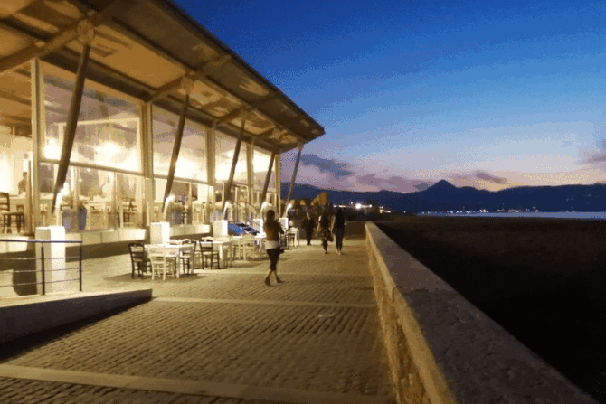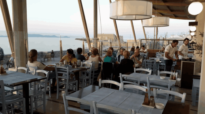 Indeed, you can have lunch here almost perfectly – delicious, inexpensive and with a view of the fortress of Koules (yes, this is one of the specialities of the restaurant). Traditional Greek snacks are especially good, but, in addition to them, you just need to try fresh fish on coals, rice with mussels and shrimps, as well as pasta with cuttlefish ink – an unforgettable experience.