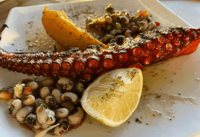 Prices are not low, but for Heraklion they are quite acceptable. For example, a portion of octopus with beans with sauce and mushrooms costs 10.60 euros, prices for hearty salads are about eight euros, and lamb chop with vegetables – 14.60 euros (prices are indicated for August 2021).
