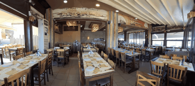 The popular inexpensive tavern Ligo Krasi Ligo Thalassa, which is located directly opposite the fortress of Koules in the port of Heraklion, offers excellent food for quite reasonable money. Democratic atmosphere in the hall, a wide selection of menus, quick waiters: the highlight of the institution is the speed of service.