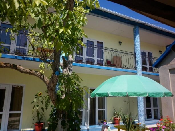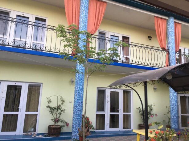 Two-storey hotel with a closed patio is located in a quiet area 600 meters from the beach and the tourist infrastructure of the village. All 17 rooms are designed to accommodate families with children, four of them are equipped with their own kitchen. For the rest, complex meals are offered. The yard is green and landscaped. There is a fountain, a gazebo with barbecue facilities, a children’s playground. The territory is completely closed, the gate is closed with an electronic lock. Parking is inside. From the building equally get to the sandy or pebble beaches. Go 10-15 minutes.