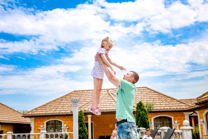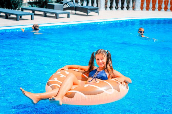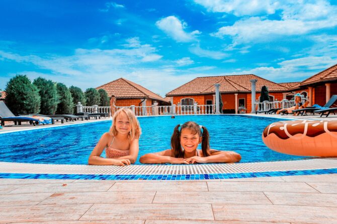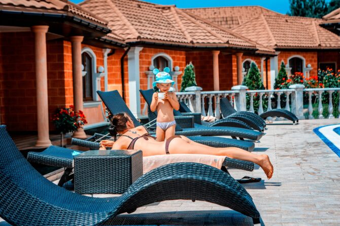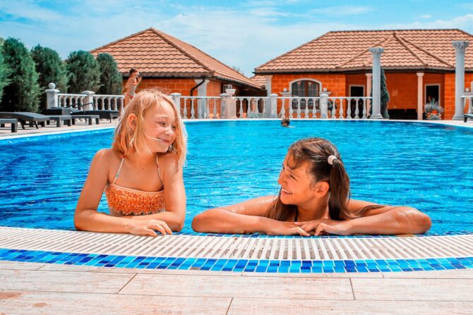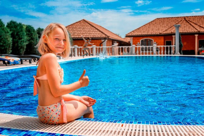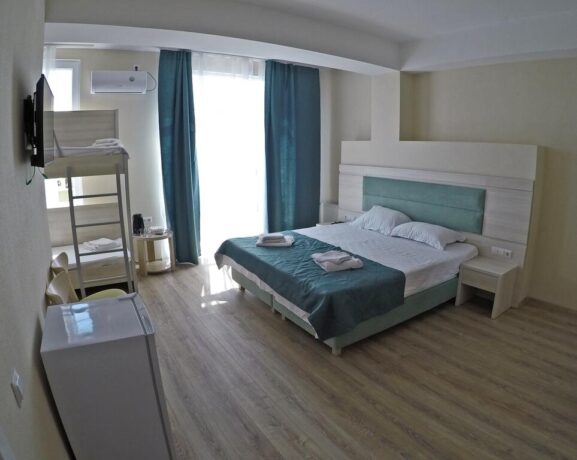 A good option for families with children will be 3 and 4-bed junior suites of the 3-star hotel “Playatina”. The territory is closed. In the courtyard of the hotel there is a swimming pool with hydromassage function, a café with home cooking, free parking. A playground is available for children. There is a lot of greenery around. The garden was laid out a few years ago. Planted thuja, cypresses, fruit trees. The beach is far away – about a kilometer, so this option is better considered for young couples with school-age children, preferably with their own transport. For the elderly and young children, it will be tiring to walk such distances.