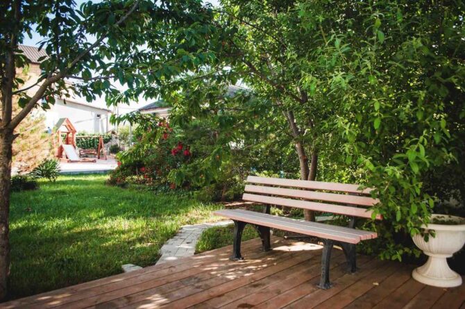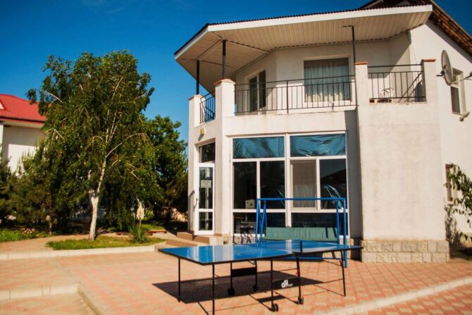 The yard is green and well maintained. There are places of rest, a gazebo with barbecue, a children’s playground, a small swimming pool. Each room has an outdoor terrace with outdoor furniture. Tennis tables are available in the building. Usually hotels of this type work only in the holiday season. Daniel is no exception.