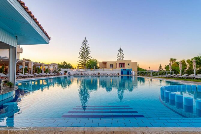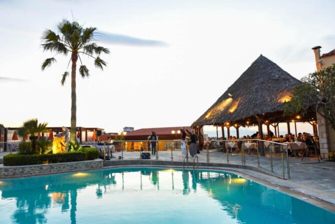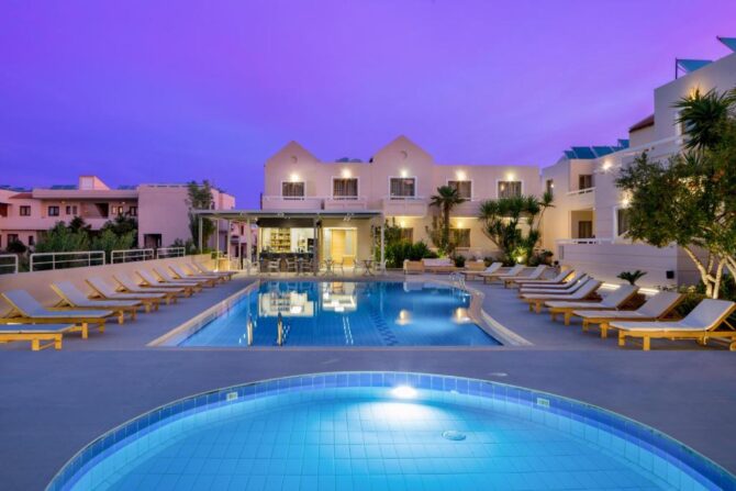 This fashionable 5-star hotel is 150 metres from Agia Marina Beach. For guests, a private area with already installed sun loungers and umbrellas is allocated. 158 rooms have been prepared for guests’ stay – 112 double standards, 32 family maisonettes, 9 junior suites and 5 family suites of V.I.P. Each room has a balcony, safe, bathroom with shower. Meals are organized according to the “All inclusive” system. Breakfast, lunch and dinner are served in the main restaurant, while alcoholic beverages, juices and cocktails are served at the bar. It offers guests: outdoor and indoor heated swimming pools, gym, bath / sauna, massage room, games room with billiards, a large TV screen for watching matches together, electronic games. For children there is a separate pool with water slides, a club is open, there are game rooms and an outdoor playground. On the beach, a special service of the hotel organizes water sports, paragliding, diving.