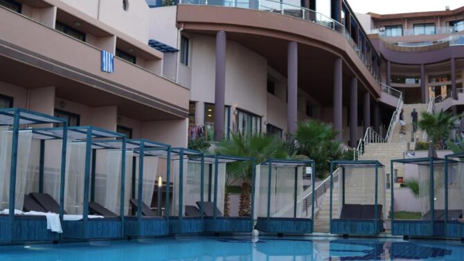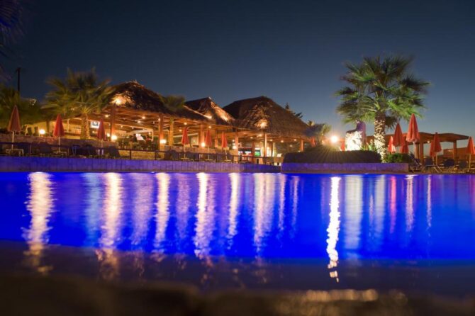 Another four-star hotel for adults is located on the beach of Agia Marina in the shopping area (1 km from the village center). The Thalassa Beach Resort & Spa has 81 rooms of six comfort categories from economy class to luxury. The complex has a swimming pool, gym, SPA with indoor pool, sun terrace. Yoga classes and a relaxing stay in the jacuzzi are provided free of charge. A buffet breakfast is served in the restaurant. Vegetarian dishes are also available.