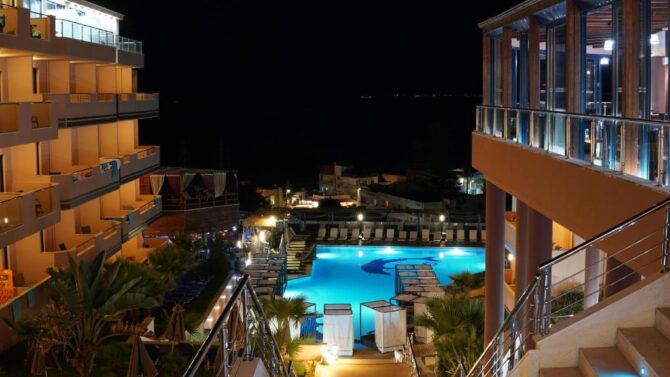 This modern 4-star hotel is a short walk from the beach. There are 59 studios, apartments and suites. All have kitchen corners. Breakfast is served in the buffet (buffet format). The restaurant specialises in Italian cuisine. The bar serves cocktails and snacks. The free service includes round-the-clock room service, umbrellas / sun loungers by the pool. The building is equipped with a sports hall, in the pool there is a children’s department. A spacious pebble beach is 400 metres away.