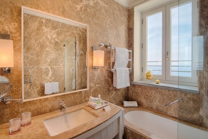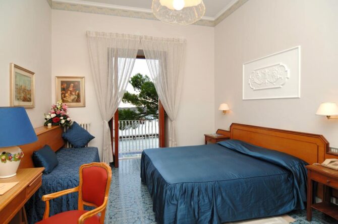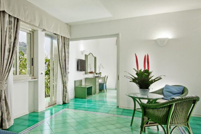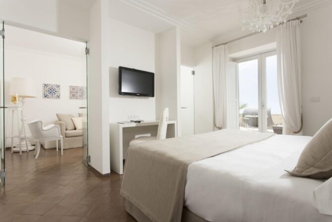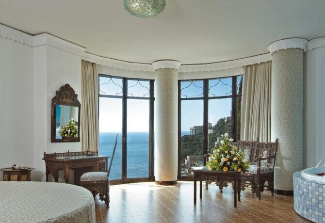 The elegant rooms are decorated in Art Nouveau style, with high-quality tiled floors and wooden furniture. The air-conditioned rooms feature a balcony with sea views, a TV, and some suites have a work and seating area.