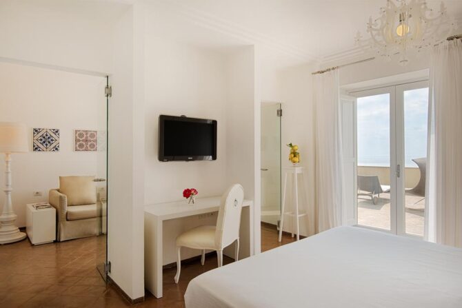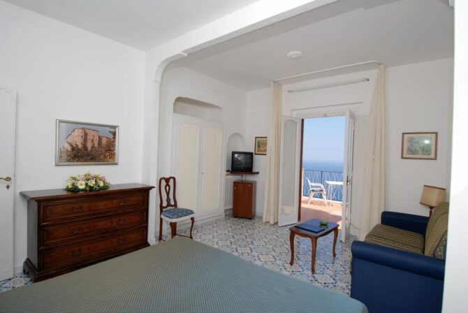 Right in the ancient Arab fortress on the Amalfi Coast is the Il Saraceno Grand Hotel. The beach is a 1-minute walk away. Guests can swim in the pool, which offers excellent panoramic views of the sea, as the pool itself is on an elevation.