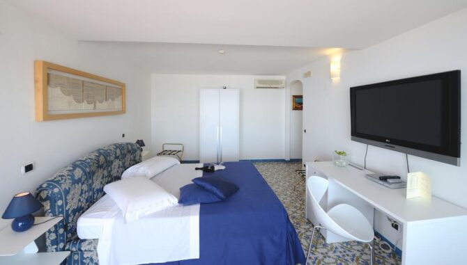 Guests can stay in modern rooms with tiled floors, the best plumbing, comfortable beds. Each room has a TV, minibar, air conditioning, toiletries and bath amenities, and some suites have a private terrace with sea views.