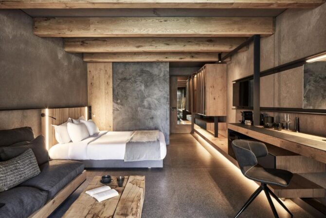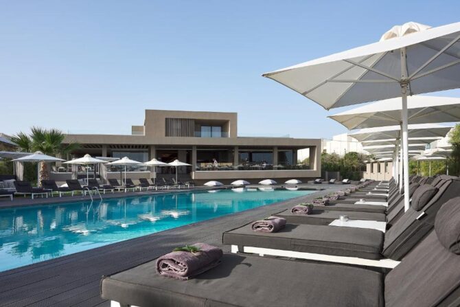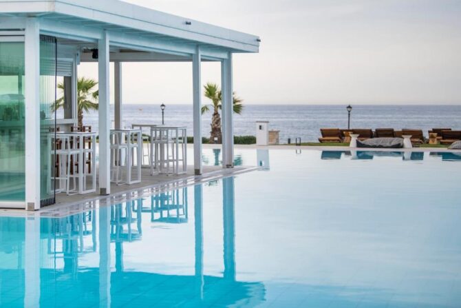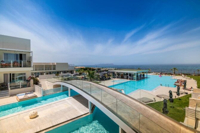 Accepting only guests over the age of 18, this 5-star hotel is a 15-minute drive from Heraklion Airport. This is the Analipsi area, on the first coastline. The hotel’s hallmark is the chic spa area and lagoon-shaped pool along the entire grounds.