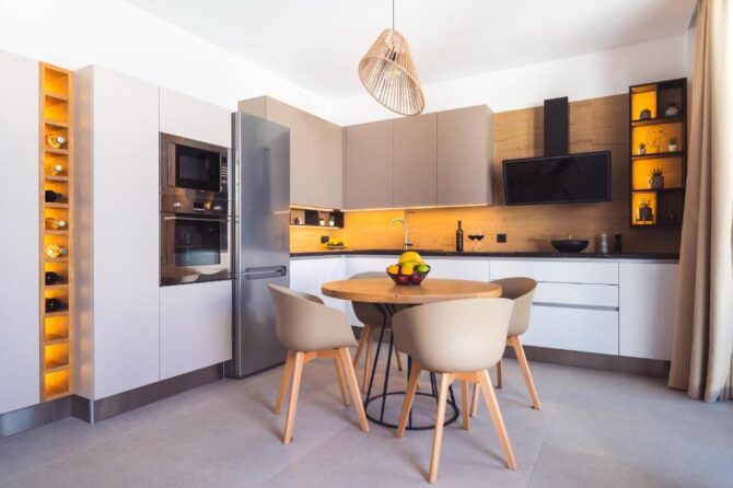 Comfortable kitchen has everything you need for self-cooking. There is also a washing machine and dishwasher.