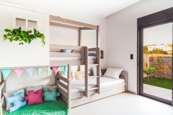 The resort is designed for guests with children, so there are spacious 4-bed family rooms. Each has a bathroom, mini – bar, comfortable furniture.
