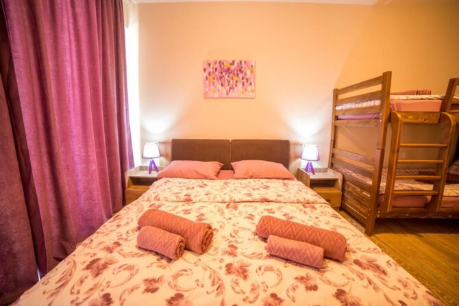 Cozy three-storey hotel “My House” offers guests two, three local, family rooms, apartments and studios. 50 meters from the entrance there is a lift “25th”. In the morning, breakfasts with delicious homemade cakes are served. The restaurant offers full board. Nearby there are cafes, restaurants and shops. But the kitchen is equipped in only one of the 8 roomson offer. Guests have access to a common seating area and a ski storage room.