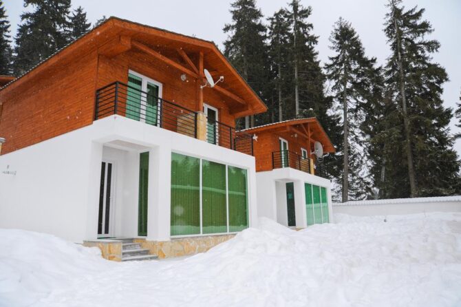 The hotel complex consists of detached holiday homes. In two-storey cottages there are 2 bedrooms with bathrooms, a common living room, a kitchen. You can prepare your own meals or visit one of the nearby restaurants. The villa is half a kilometer from the Beginner Ski Slopes. An indoor pool is a 10-minute walk away. Free parking is available on site.