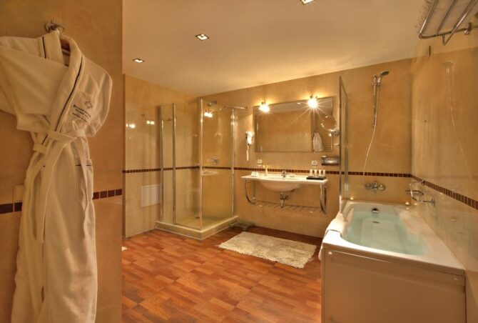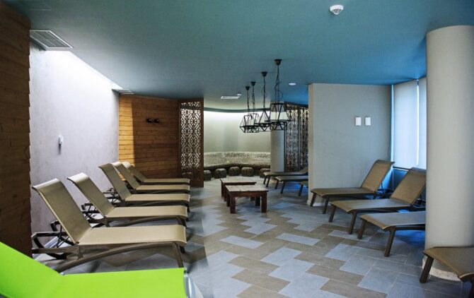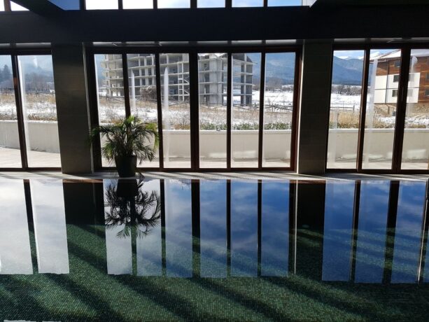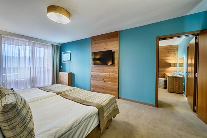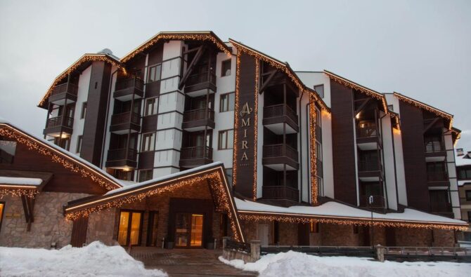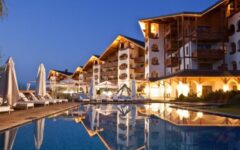 The 5-star hotel is the only one in Bansko with direct access to the ski slopes. It is located in the center of the resort, the gondola lift is located opposite the entrance. The fund consists of 157 rooms. Of these, the main part is double. There are also junior suites, suites and one presidential suite. There are 2 on-site restaurants. Breakfast is served at the Gallery and themed buffet meals are served. Come Prima specialises in gourmet cuisine. The chef has assembled an international team of chefs ready to surprise guests with exquisite tastes with their masterpieces. In winter, another restaurant Sushi Bar and Teppanyaki Grill opens. It features a huge spa with swimming pools. saunas (Finnish, herbal, infrared), baths, cosmetology rooms, hot tubs, a unique snow room and a therapeutic area of complete detoxification. Staff look after the children free of charge during their games at the club. The building is equipped with a ski storage room, and guests are given SKI passes of VIP class.