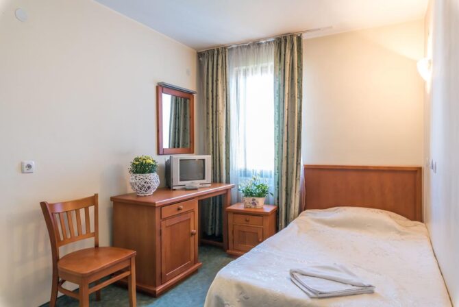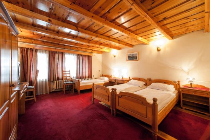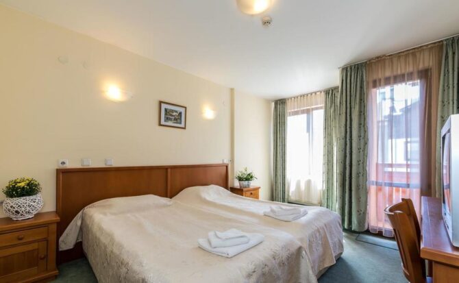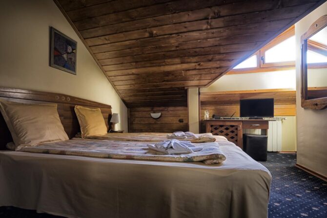 If 5 stars are not quite affordable, then you can consider a cozy family hotel,which is located 300 meters from the municipality of Bansko and 1.7 km from the nearest ski lift. Single, double, family rooms,suites and apartments are decorated in a rustic style, something reminiscent of comfortable sanatoriums of the Soviet period. Breakfast is served in the morning, there is free parking, sauna. It accepts pets for a fee.