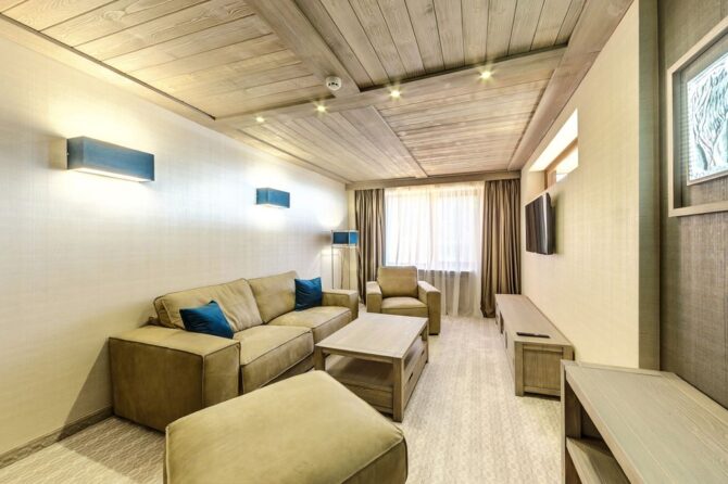400 meters from the gondola lift is a large hotel complex. Its modern design and amenities are highly appreciated by visitors. Studios, double rooms and apartments are available for accommodation. Superior rooms have a jacuzzi. The restaurant serves breakfast, a spa with swimming pool, a terrace, a children’s playroom, a storage room for sports equipment. Payment for the transfer to the lower station of the gondola is not charged. Car rental is available.