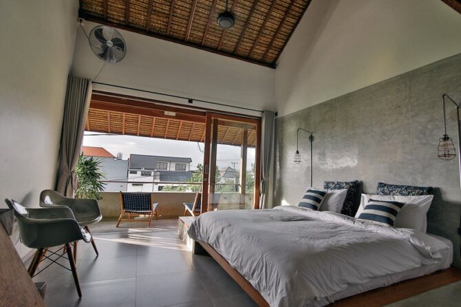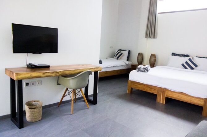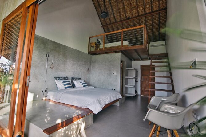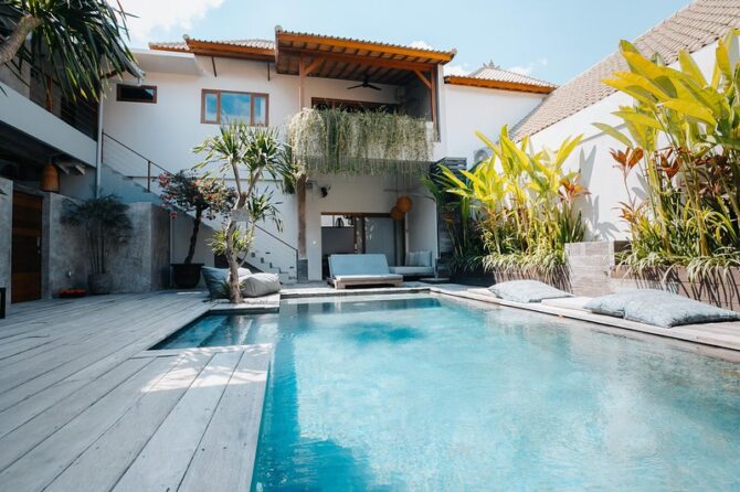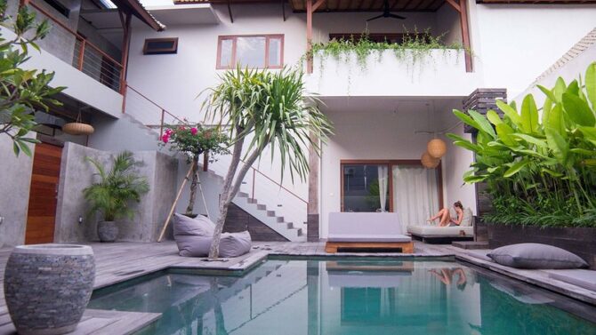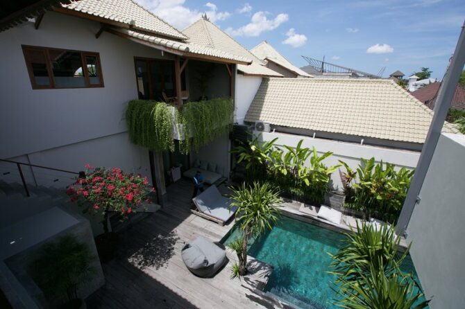 Vassani is a modern guest house in the centre of Canggu. The rooms here are comfortable, clean and cozy, each with a nice garden with a swimming pool attached to each. The guest house is a 5-minute walk (300 m) from the beach, Bali’s most popular surfing spot. This modest complex consists of only seven apartments with a minimalist design, some of which have kitchens, workstations and mezzanines, as well as a communal pool in the center. The hotel is located in the heart of paradise, just a few steps from the best bars, spas, boutiques and cafes of Canggu.