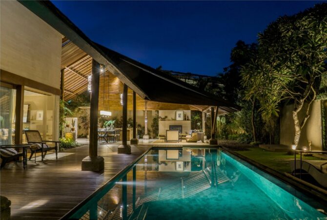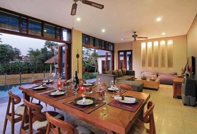 The luxury holiday home has two villas with seven large bedrooms, comfortably accommodated fourteen people at a time. The infrastructure is represented by private pools and high-quality service. The price includes a daily breakfast, apartments with a private pool, home cinema, fully equipped kitchen with coffee machine. It also offers a free airport pick-up service and regular trips around the Canggu area.