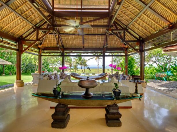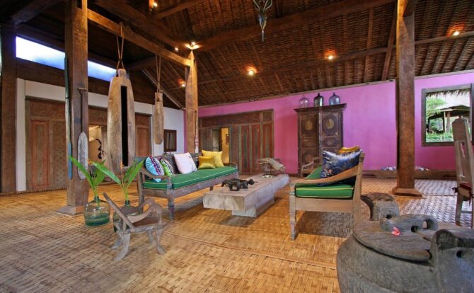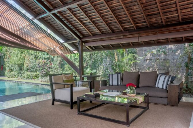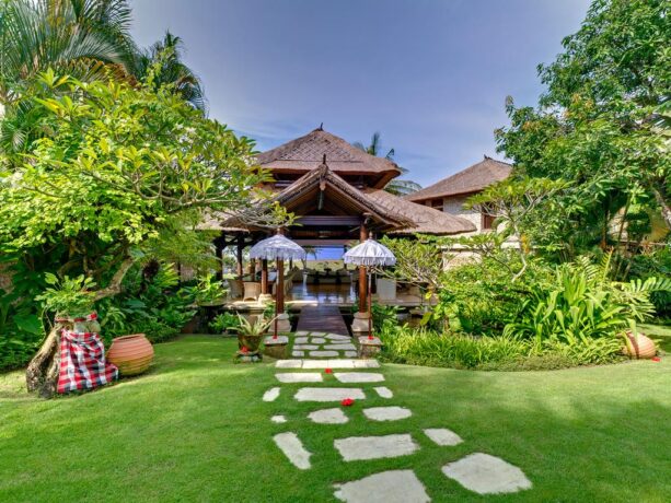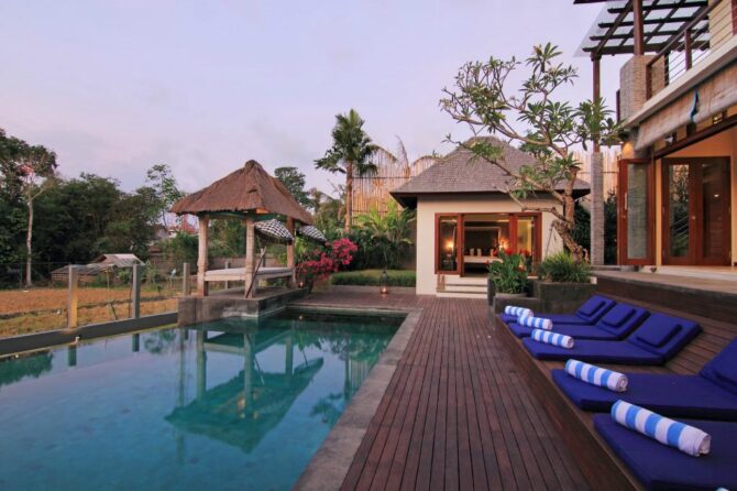 Guests can use the large swimming pool with a charming thatched gazebo, outdoor yoga studio, spa.
