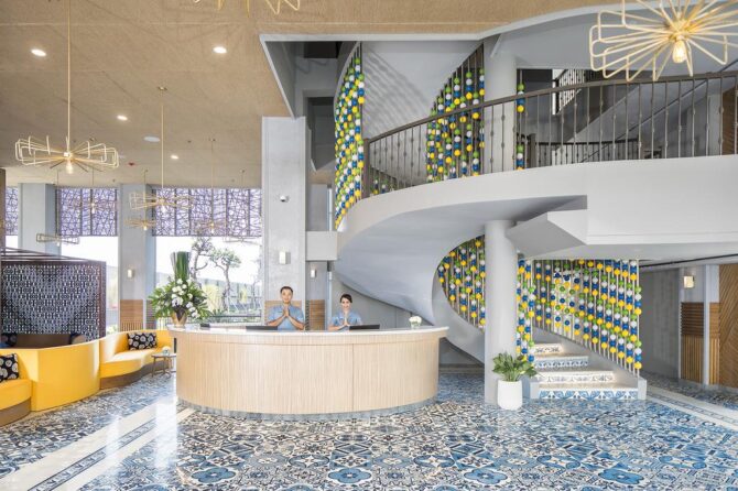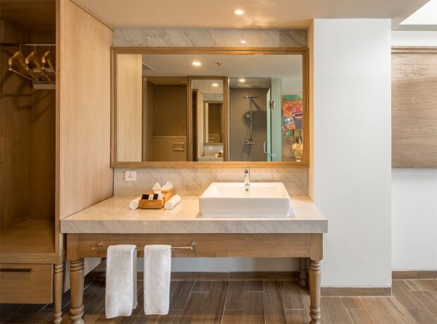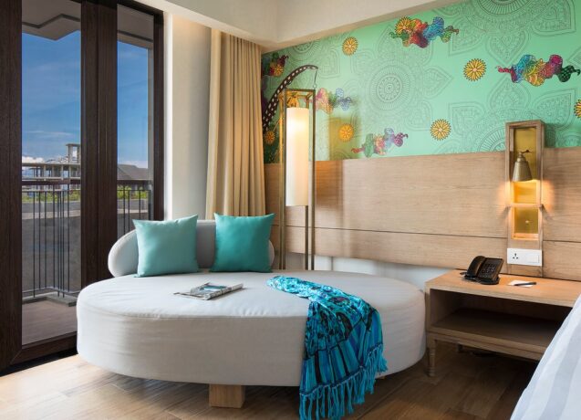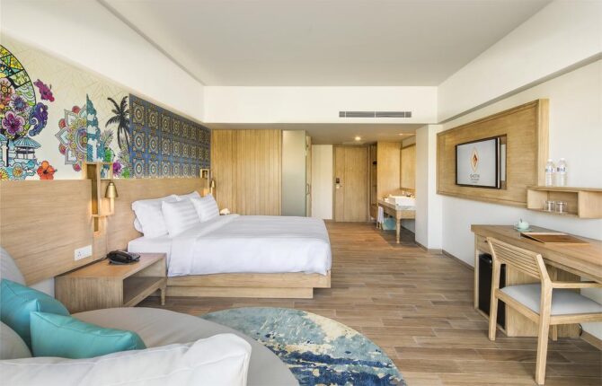 The number of rooms consists of 119 apartments and suites ranging from 37 to 60 sq. m. The overall design of the hotel is made in a modern Balinese style. All rooms are equipped with free Wi-Fi and all amenities. The infrastructure includes a branded restaurant, a gym, a large and children’s pools, a library and a small banquet hall.