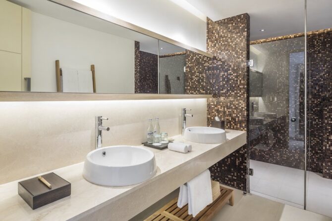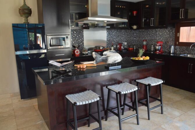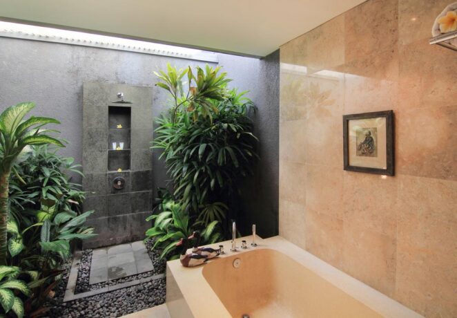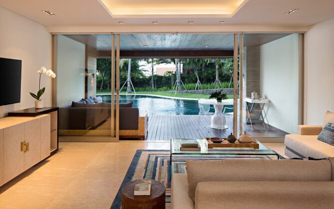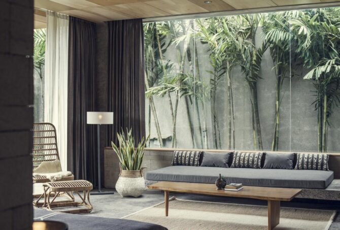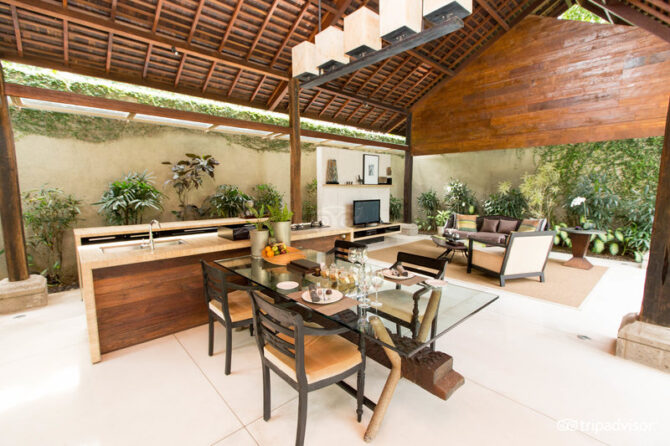 In total, the hotel has 13 one-bedroom villas and one three-bedroom villa (Grand Villa), all of them are decorated in a modern Balinese style with dark wood, travertine, stone and glass. All villas have an equipped seating area, a full kitchen and a bathroom with a shower.