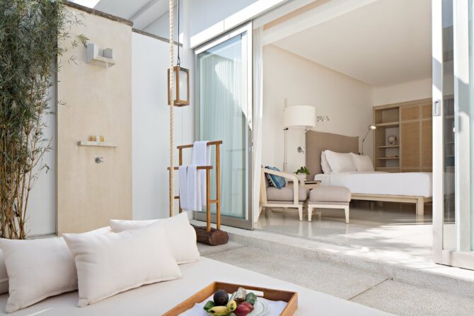The private on-site chef creates a delicious menu. Meals are served in the outdoor pool dining room, individually in each villa. The menu includes beef, lamb and seafood dishes, vegetarian options and simple snacks. The à la carte breakfast includes juices and cocktails, a variety of cereals and pastries, and cooked main courses.