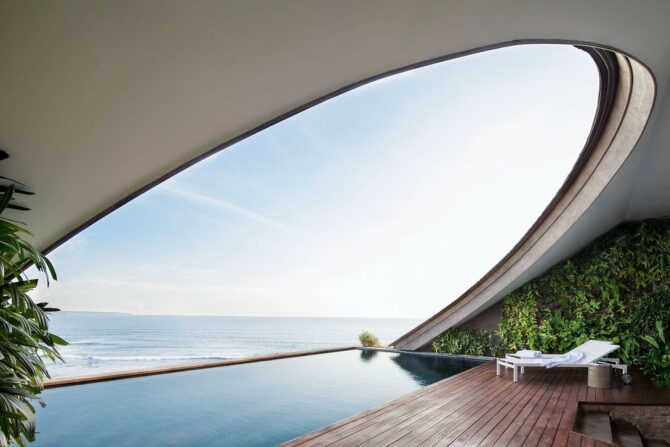 A boutique hotel on the coast is an elegant combination of the Mediterranean and the local Balinese atmosphere. The rooms are decorated with light wood, terraces and swimming pools. The communal pool is equipped with an outdoor jacuzzi and water slides.