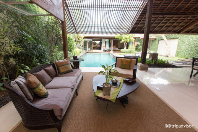 This luxury hotel is designed by indigenous Indonesians. The territory of the hotel is tropical and sultry. The narrow open corridor leading to the villas is decorated with exotic plants and flowers, and there are ponds with koi carp in the garden. Guests live in stylish separate villas. Service is carried out by the butler assigned to the villa. Guests are entitled to a free round-the-clock transfer to both Seminyak and Canggu.
